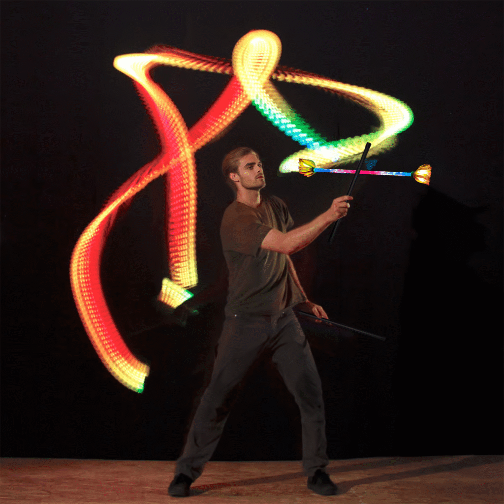Devil sticks, also called flower sticks or juggling sticks, are a classic prop in circus arts. The setup includes one central “baton” and two hand sticks. The goal is to control, spin, and toss the main stick using only the two side ones — without ever dropping it.